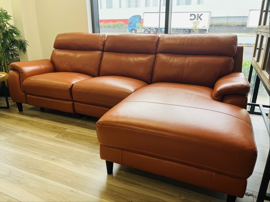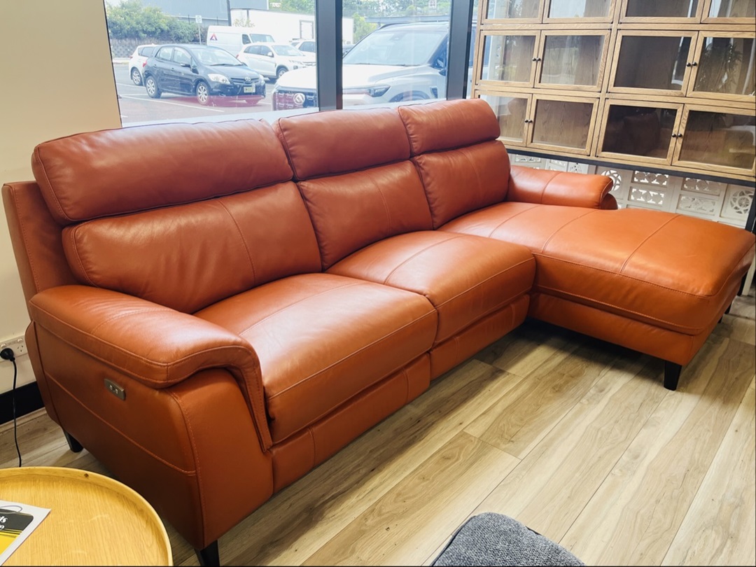 A luxurious burnt orange leather chaise sofa featuring electric recline functions for ultimate relaxation. Combines vibrant color with advanced comfort technology. A stylish centerpiece for modern homes.