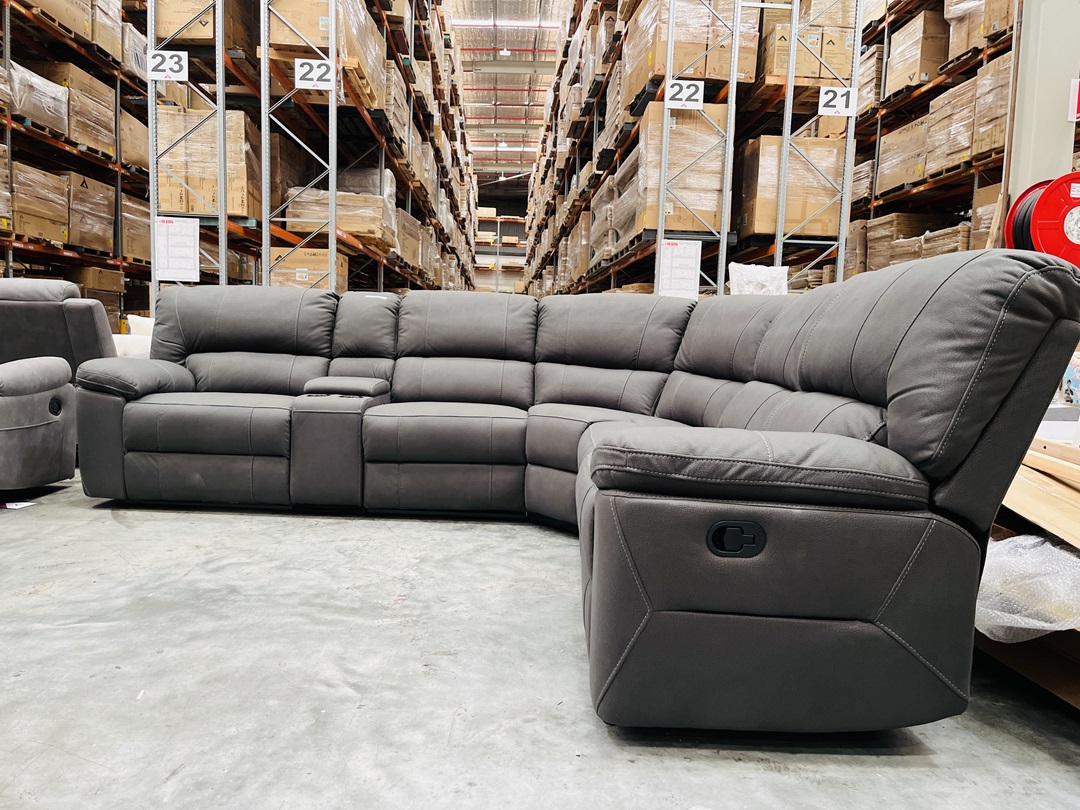 Spacious corner lounge with manual recliners, integrated cupholders, and a hidden storage tray. Upholstered in durable charcoal fabric for comfort and convenience.