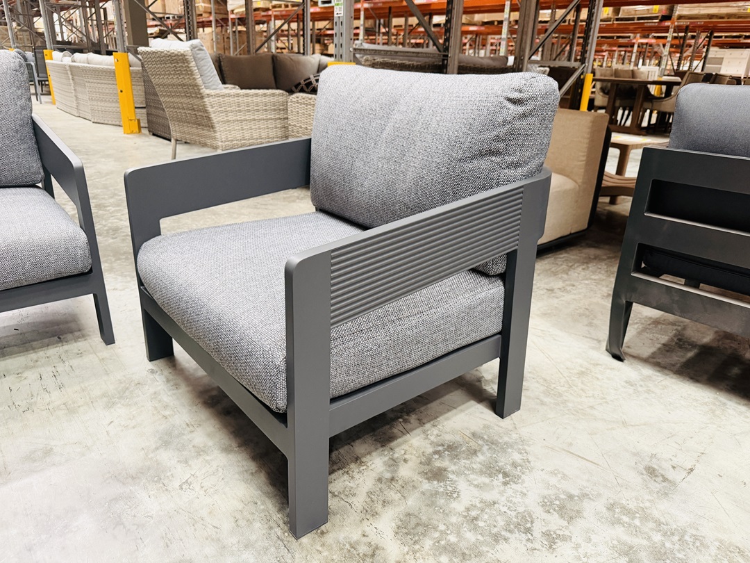 A sleek and modern dark grey outdoor armchair designed for comfort and durability. Its sturdy construction and weather-resistant materials make it ideal for any patio or garden, providing a stylish seating option with its clean lines and contemporary design.