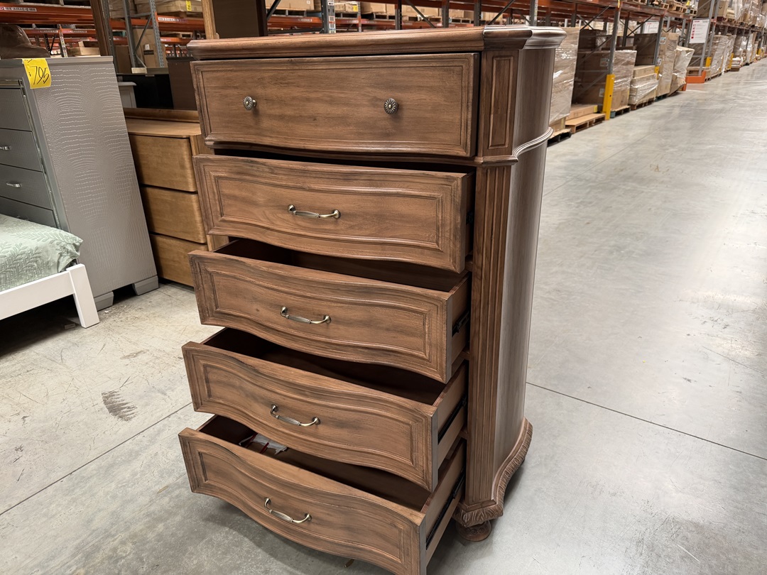 A sturdy timber tallboy crafted in a rich chestnut brown finish with five spacious drawers that provide generous storage while adding warmth and elegance to your room.