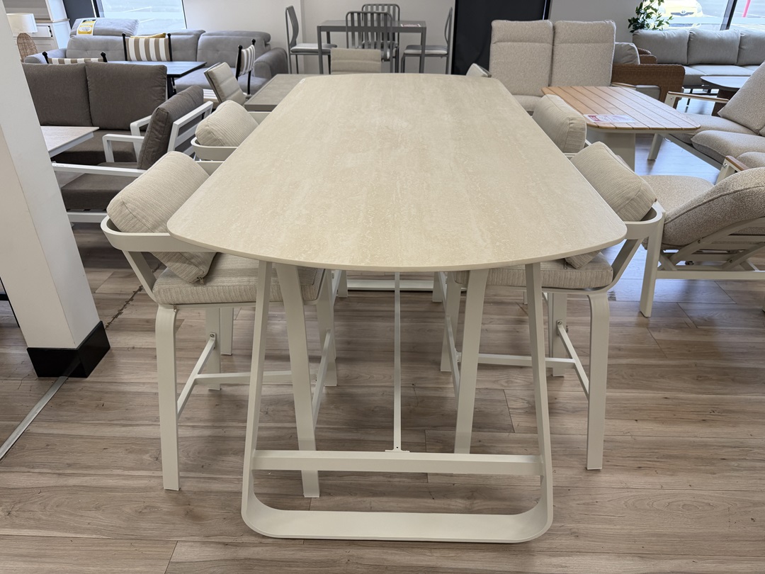 The Cream 5pc Sintered Stone Top Bar Setting offers a refined bar-style dining experience with a durable sintered stone top and a soft cream finish, perfect for stylish outdoor entertaining.