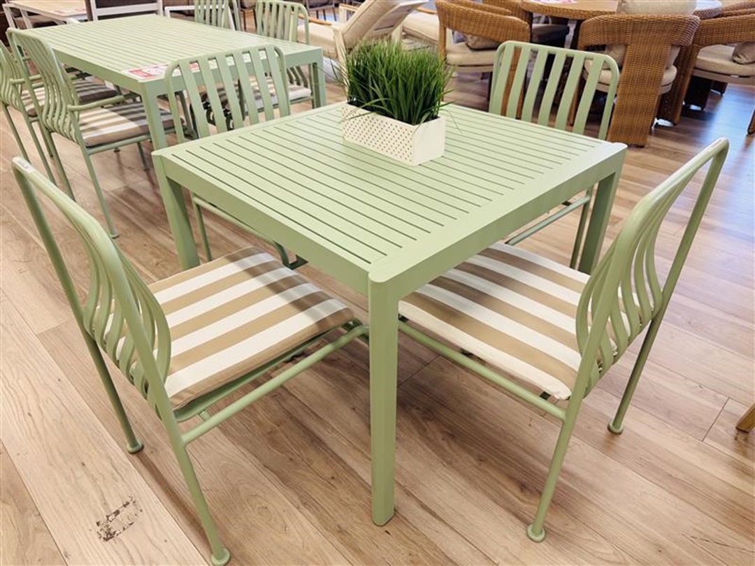 A vibrant 4-piece outdoor sofa set in green fabric, featuring a sofa, two armchairs, and a matching coffee table. Its durable construction and lively color add charm to outdoor spaces.