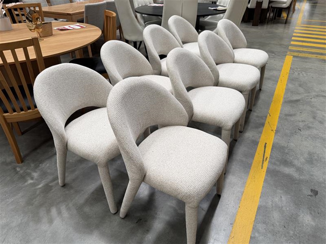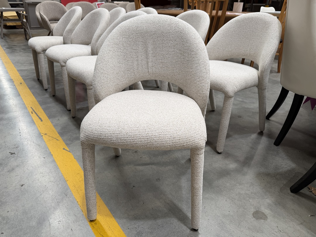 A stylish dining chair upholstered in soft cream fabric, offering comfort and an elegant modern look. Perfect for contemporary dining spaces seeking a light, neutral tone.
