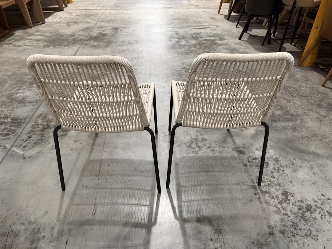 A stylish cream rope outdoor chair with sturdy metal legs, offering breathable comfort and a modern look for balconies, patios, or garden dining.