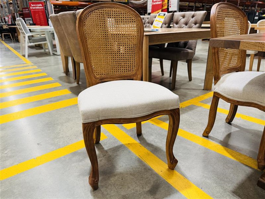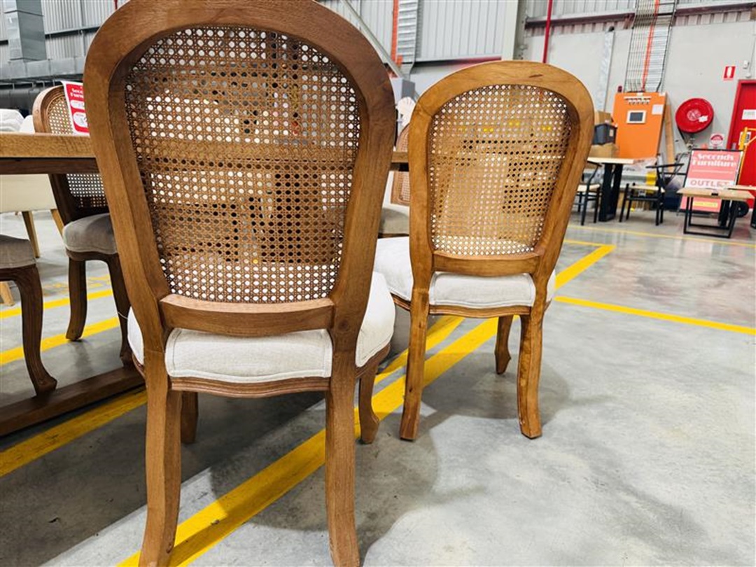 Beautifully crafted dining chairs featuring curved timber frames with rattan detailing and soft beige fabric seats. Designed for comfort and style, they bring a natural and elegant touch to any dining space.