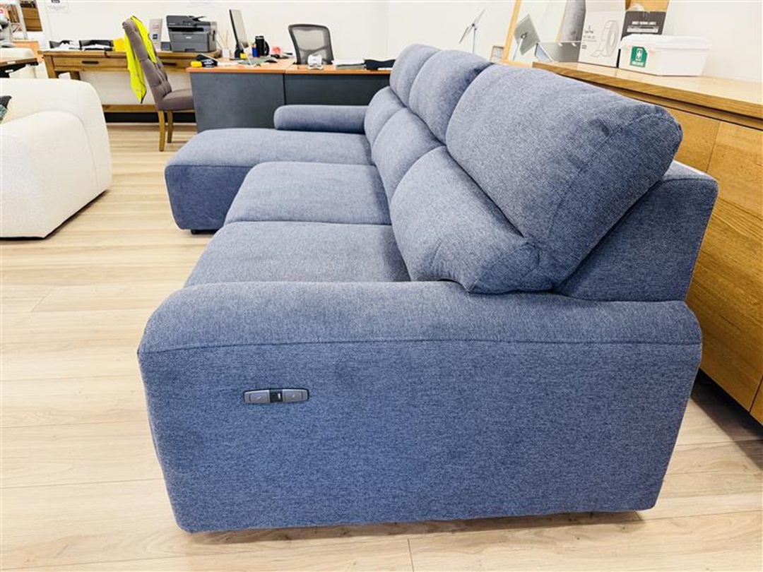 A modern electric chaise sofa upholstered in deep dark blue fabric, offering both visual impact and exceptional comfort. The electric recline function ensures effortless relaxation with a sleek, contemporary finish.