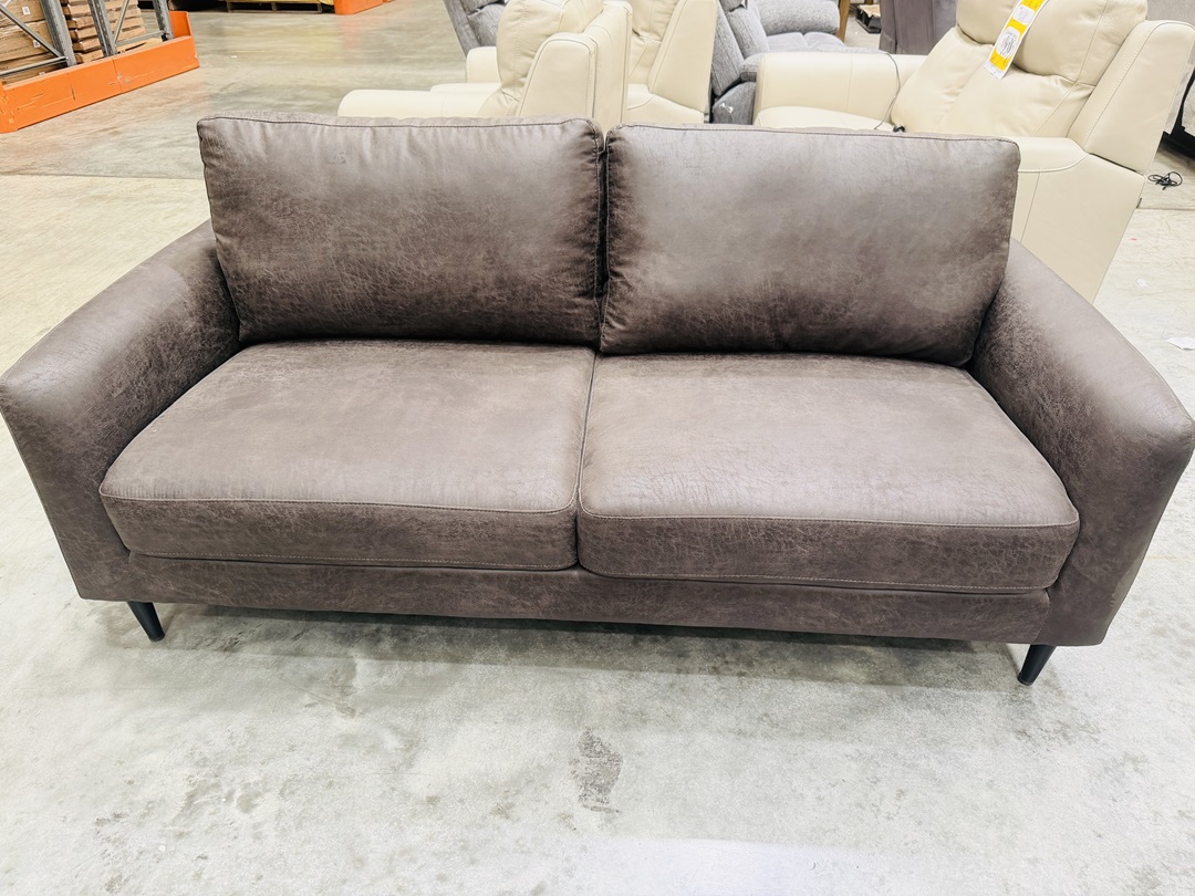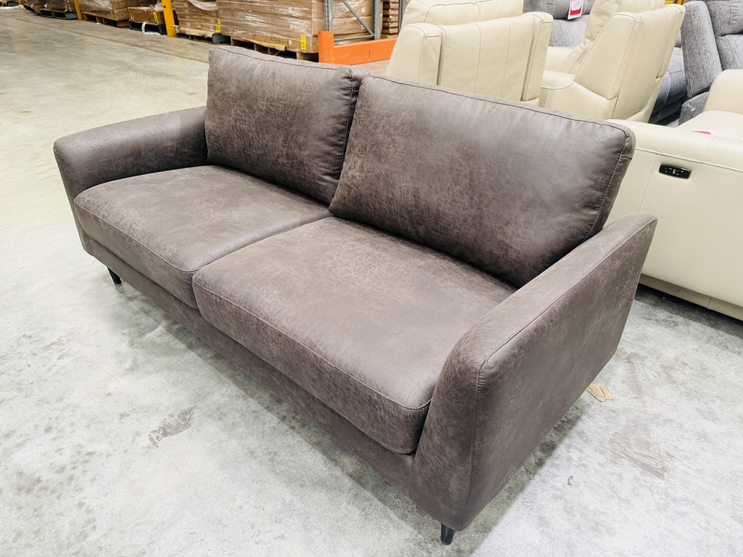 A comfortable and durable couch upholstered in dark brown fabric. Designed for everyday use, it offers supportive seating and a classic look suitable for any living space.