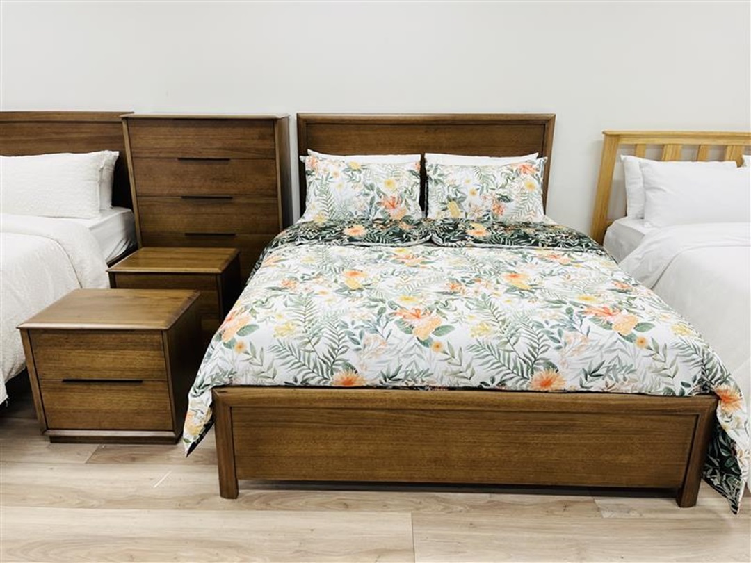 A rich, rustic-style bedroom suite crafted from durable hickory-toned timber. Includes a queen bed frame, two bedside tables, a tallboy, and a matching dresser, all designed with timeless lines and a natural wood grain finish.