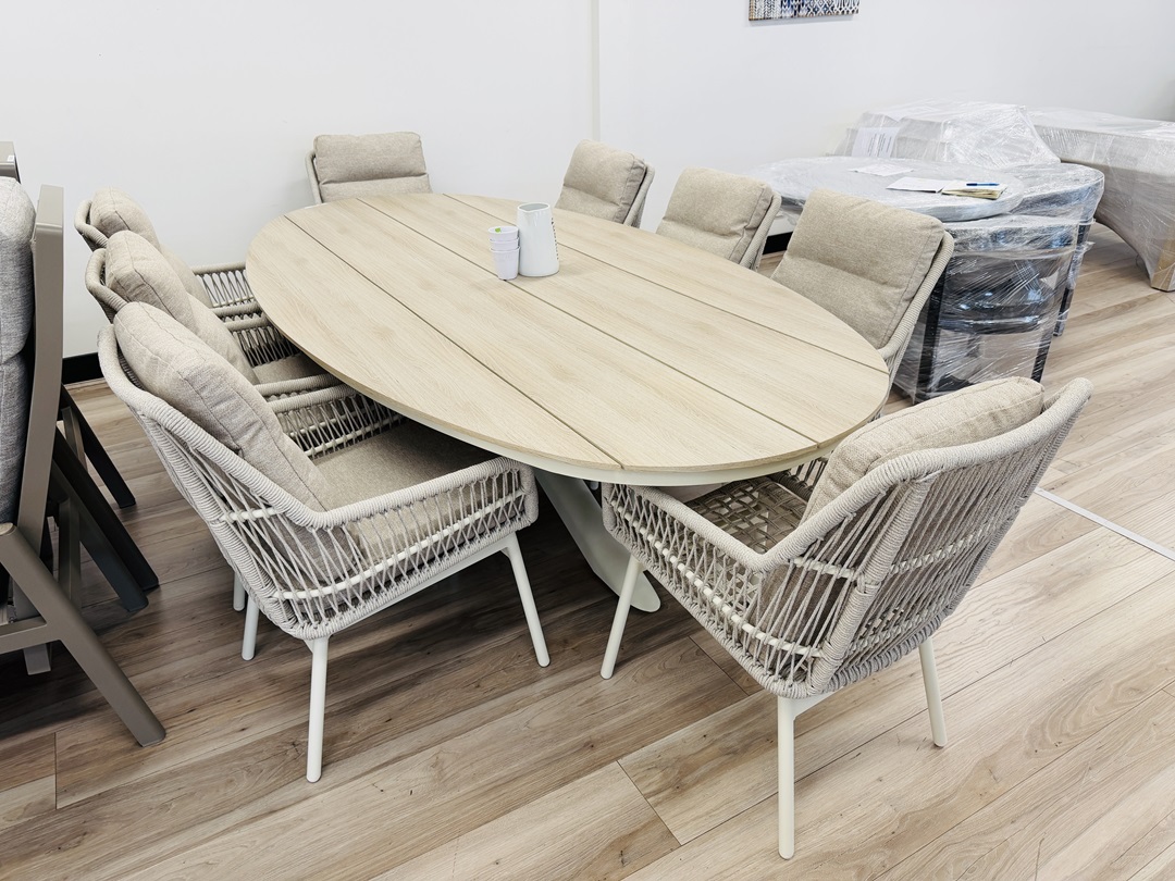 A chic and spacious nine-piece outdoor setting featuring a large white dining table and eight matching chairs. Perfect for al fresco dining with family and friends in a bright, modern setting.