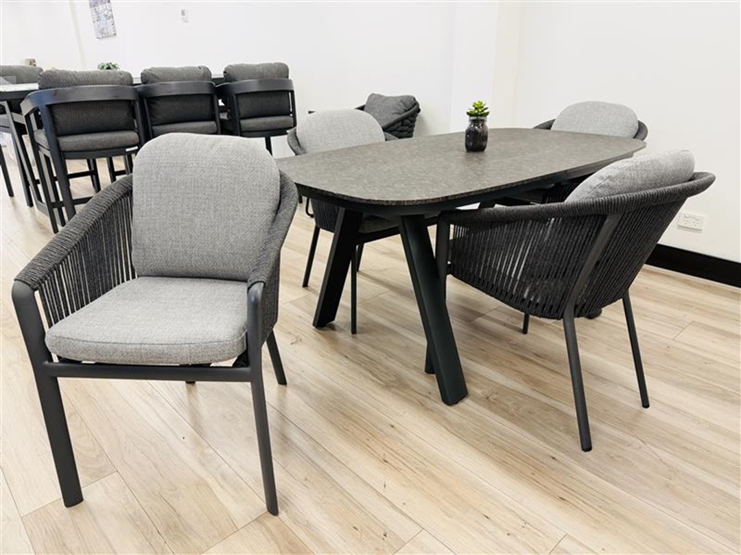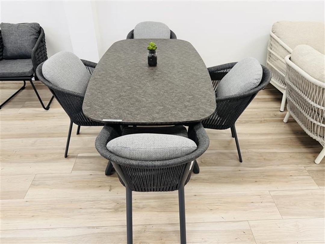 The Dark Grey 5pc Outdoor Dining Set delivers a clean, modern outdoor dining solution with a sturdy table and matching chairs, designed for durability and everyday outdoor use.