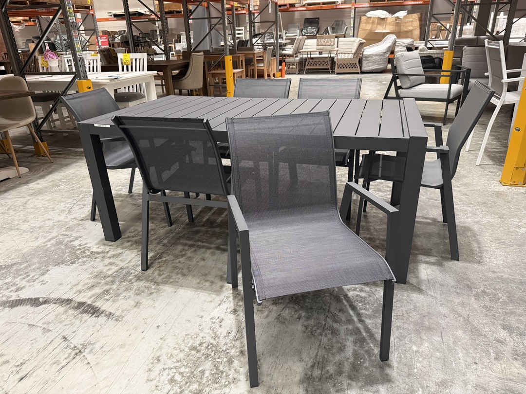 A durable dark grey aluminium 7-piece dining set featuring a sleek table and six matching chairs ideal for stylish and long-lasting outdoor entertaining.