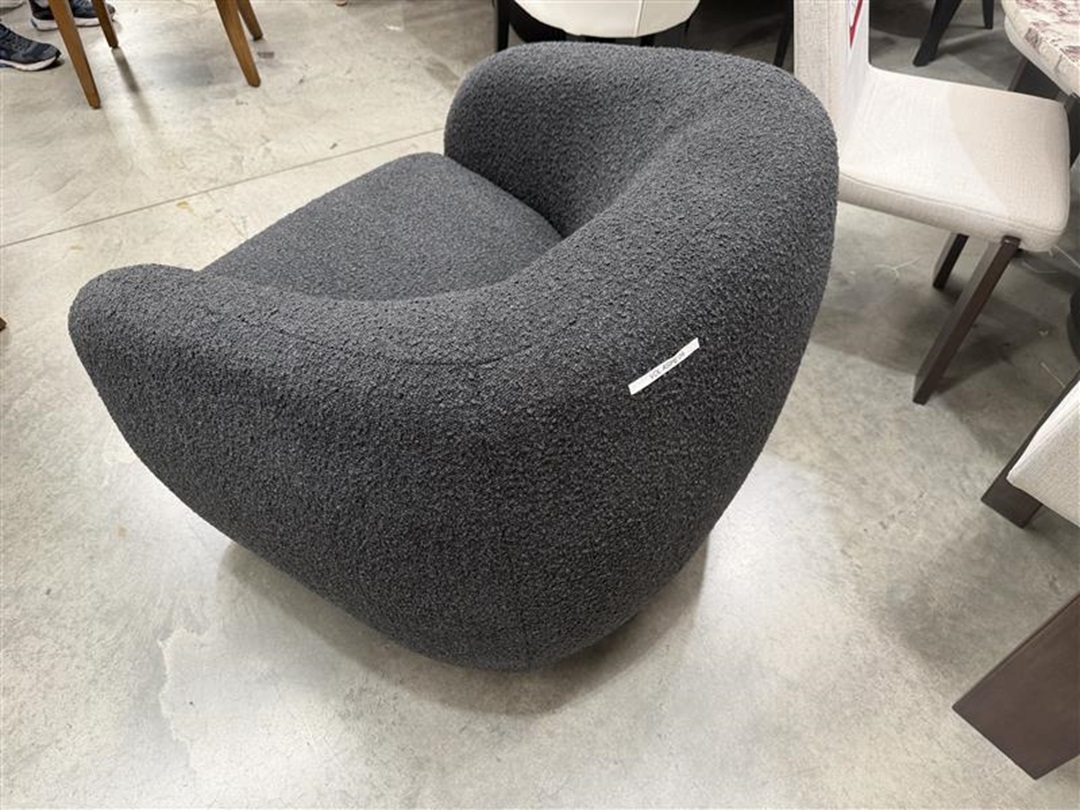 A contemporary armchair wrapped in textured dark grey boucle fabric. Provides deep comfort with a modern curved silhouette suitable for living or bedroom corners.