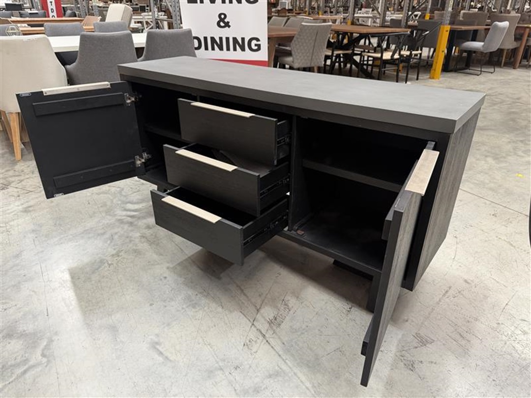 A contemporary buffet with a durable dark grey concrete-style top. Includes two spacious doors and three drawers for convenient dining room storage and stylish presentation.