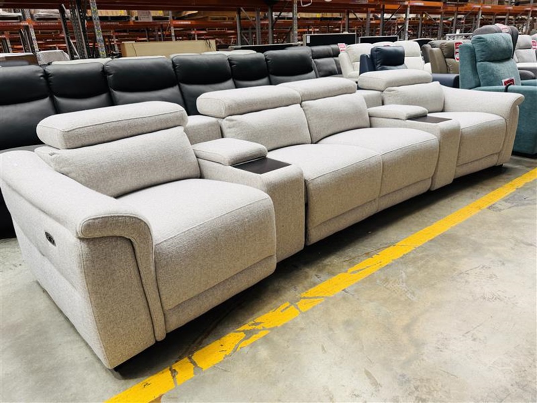 A luxurious 3+2 sofa set upholstered in silver grey leather that features smooth electric reclining functions for ultimate comfort and modern living room style.