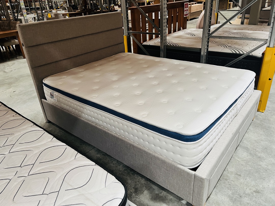This queen bed package features a refined dove grey fabric finish for a modern, elegant touch. The included mattress ensures complete comfort and value. A contemporary choice that suits a wide range of interiors.