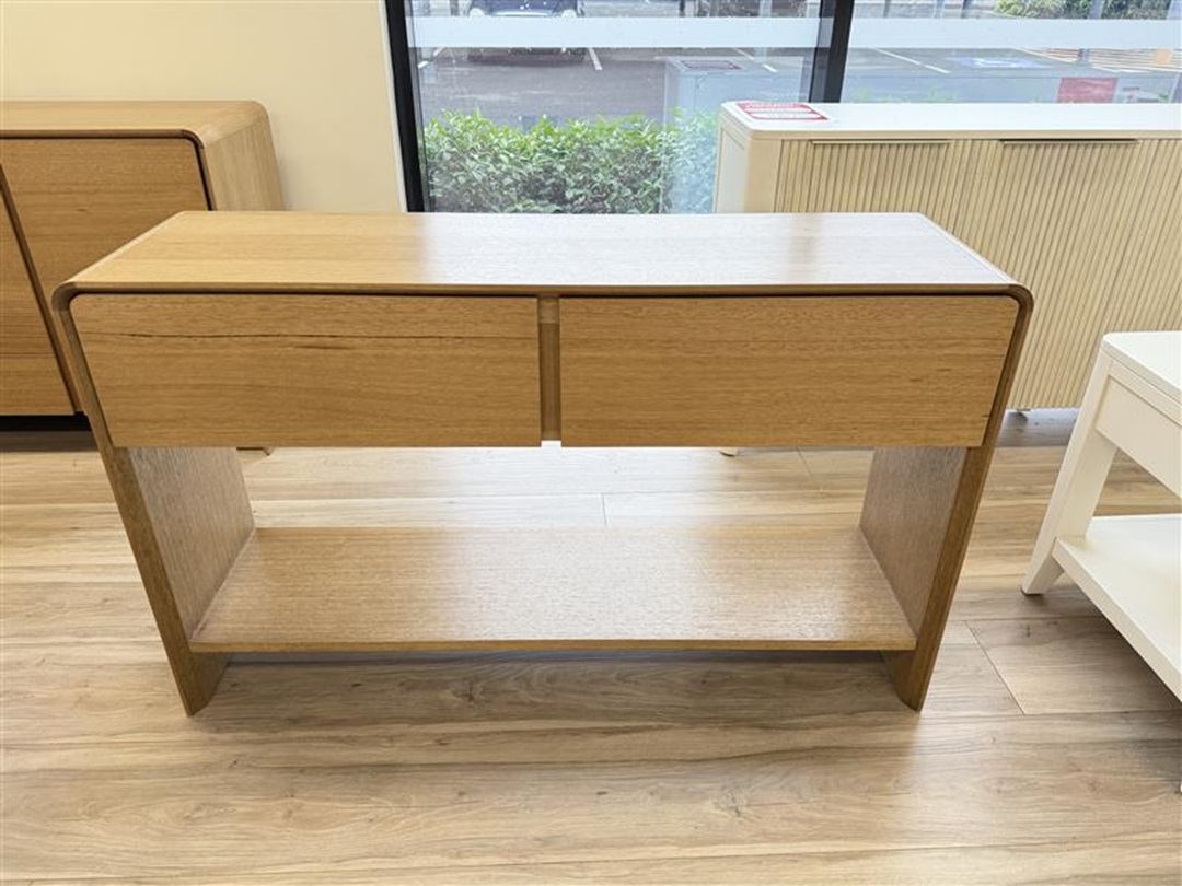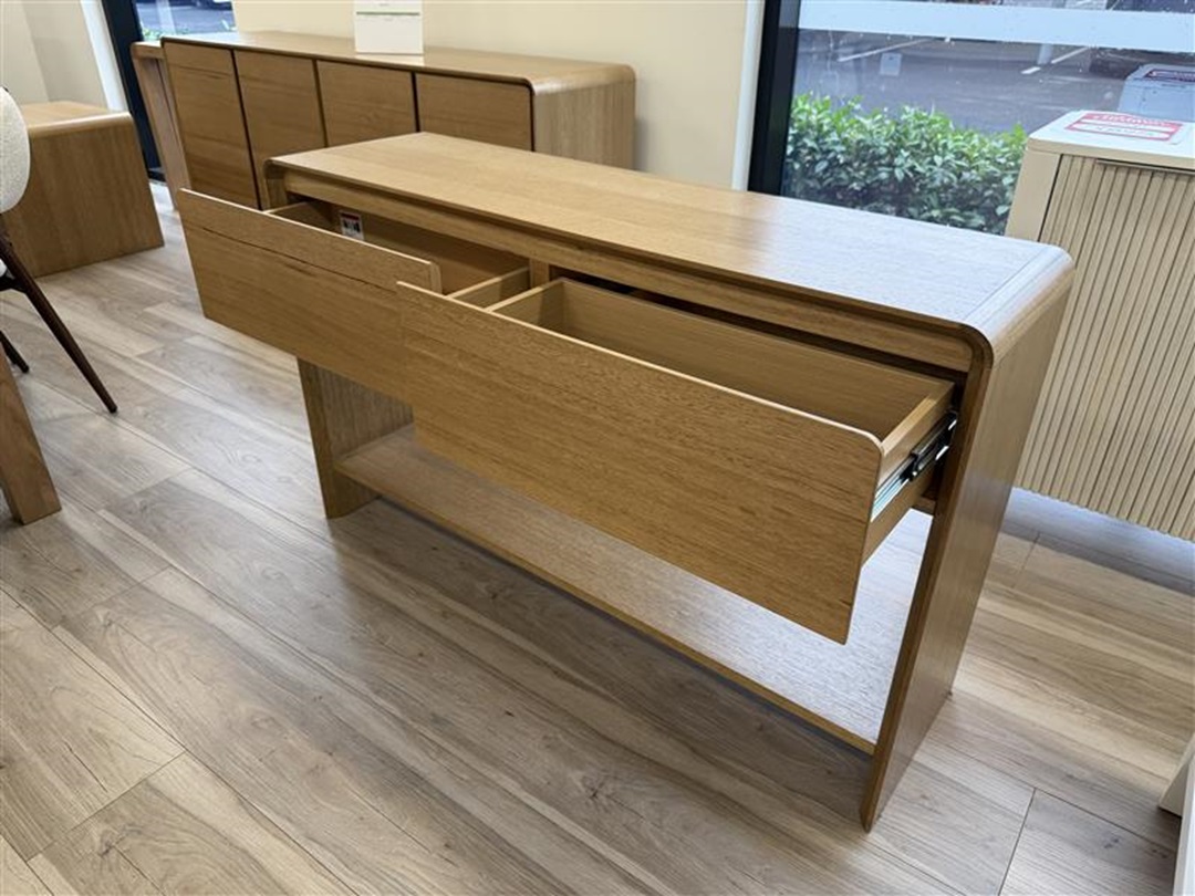 This refined hall table features two drawers, perfect for storing keys, mail, and small essentials. Crafted from golden oak timber for lasting quality. Adds a warm and welcoming touch to any entryway.