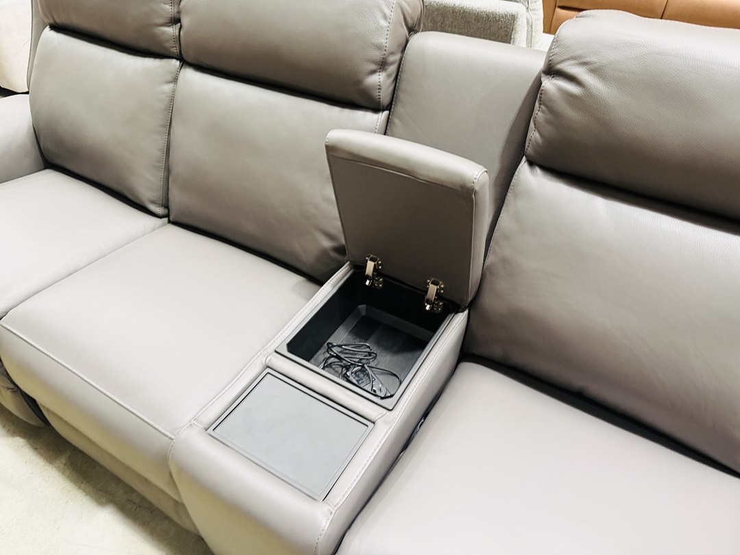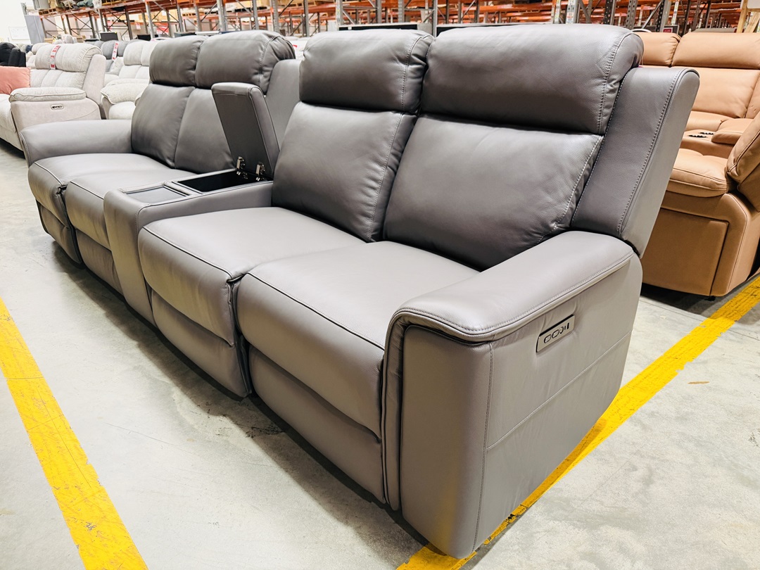 A premium 4-seater home theatre lounge upholstered in luxurious graphite leather. Equipped with electric reclining seats and a central storage console with cup holders, it delivers ultimate comfort for movie nights.