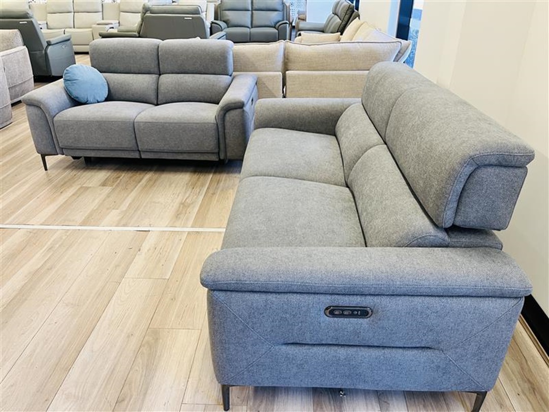 This luxurious 3+2 sofa set features soft grey fabric upholstery with electric recliners for ultimate comfort. Adjustable headrests provide personalized support and relaxation. A modern, functional addition to your living room.