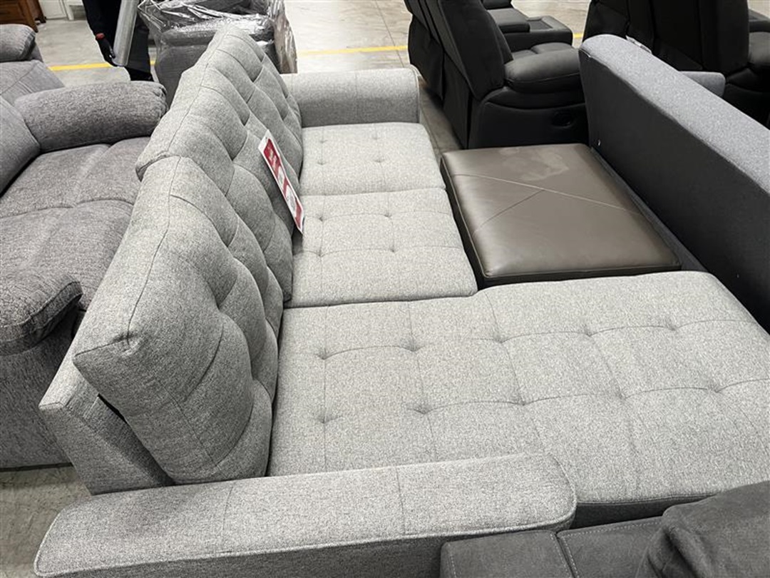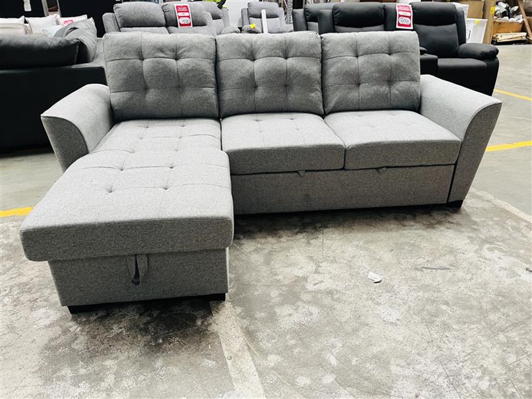 This versatile grey fabric chaise sofa offers comfort, style, and functionality. It easily converts into a pull-out sofabed with hidden storage for blankets or pillows. Ideal for maximizing space in modern living areas.