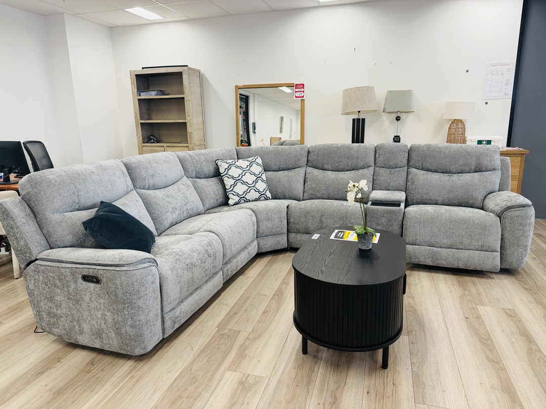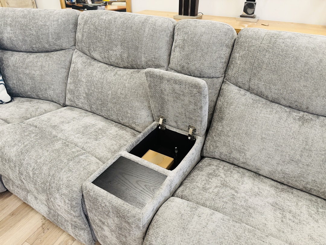 A premium corner modular sofa finished in soft grey fabric. Equipped with electric recliners and built-in storage, it offers ultimate comfort, flexibility, and modern functionality.