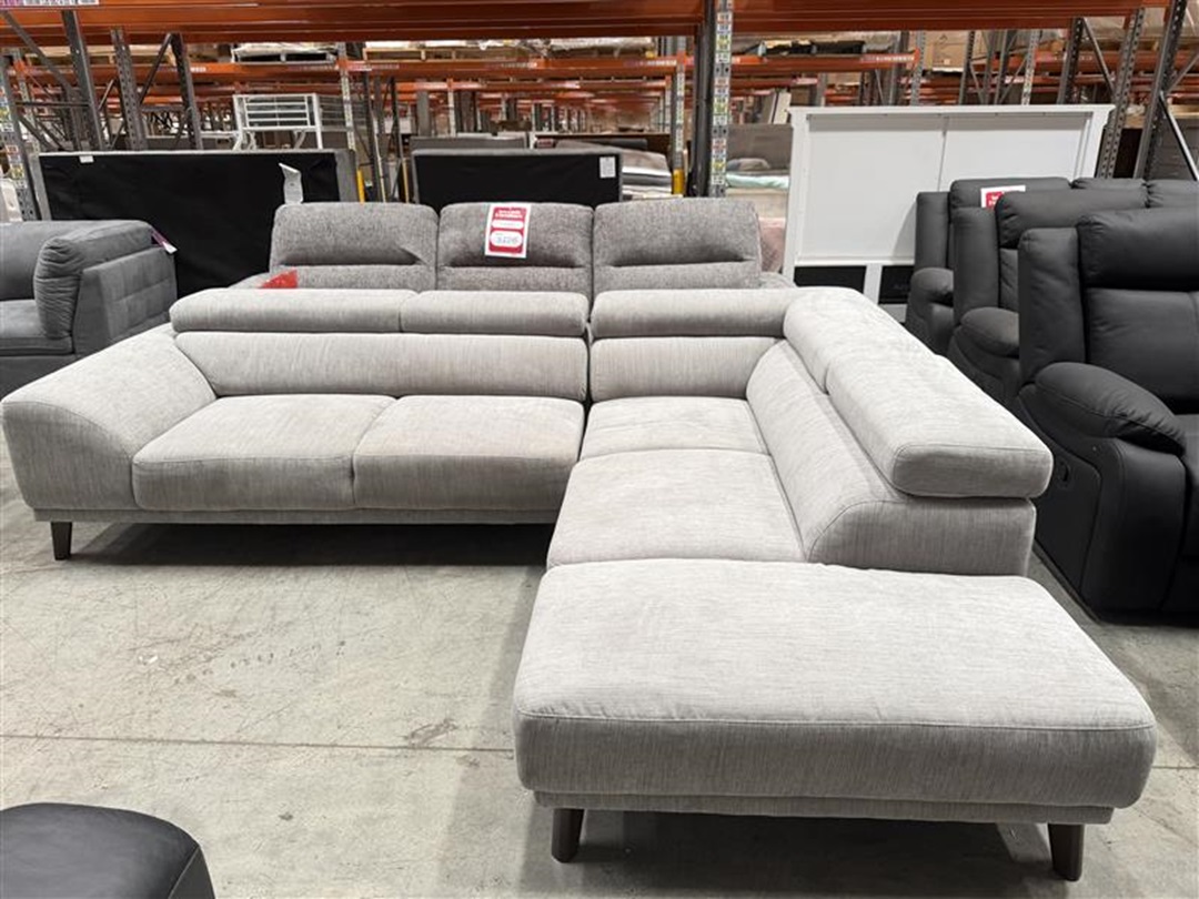 A spacious corner sofa upholstered in soft grey fabric to suit any interior style. Designed with deep seating for exceptional comfort and everyday use. Ideal for families and large living rooms.
