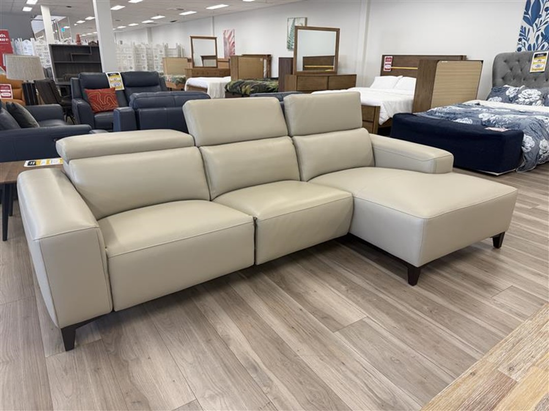 A luxurious beige leather recliner with full electric controls, including an adjustable headrest for customized comfort.