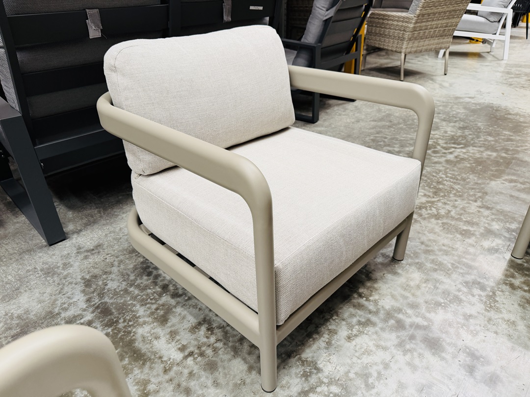 A modern outdoor lounge set featuring a durable aluminium frame in a sleek grey finish. This 4-piece setting includes comfortable cushioned seating designed for relaxation and outdoor entertaining, offering both weather resistance and contemporary style for patios or garden spaces.