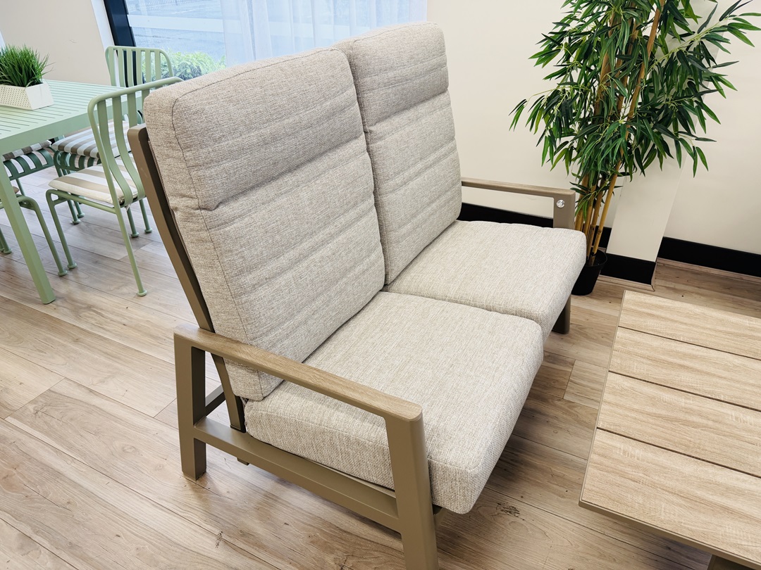 A contemporary 4-piece outdoor sofa set featuring supportive highback seating and comfortable cushions. Ideal for relaxing outdoors while adding modern style to patios or garden areas.