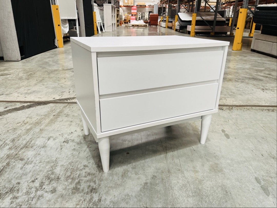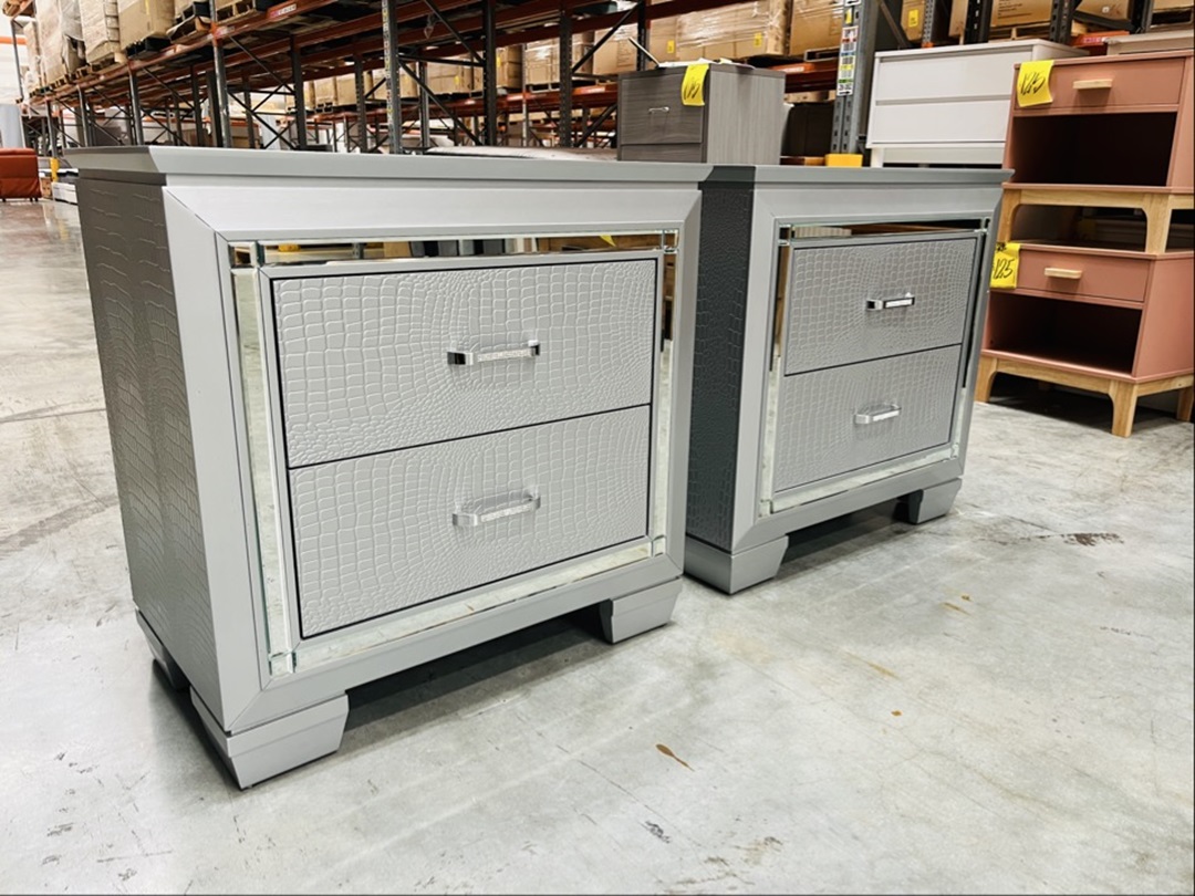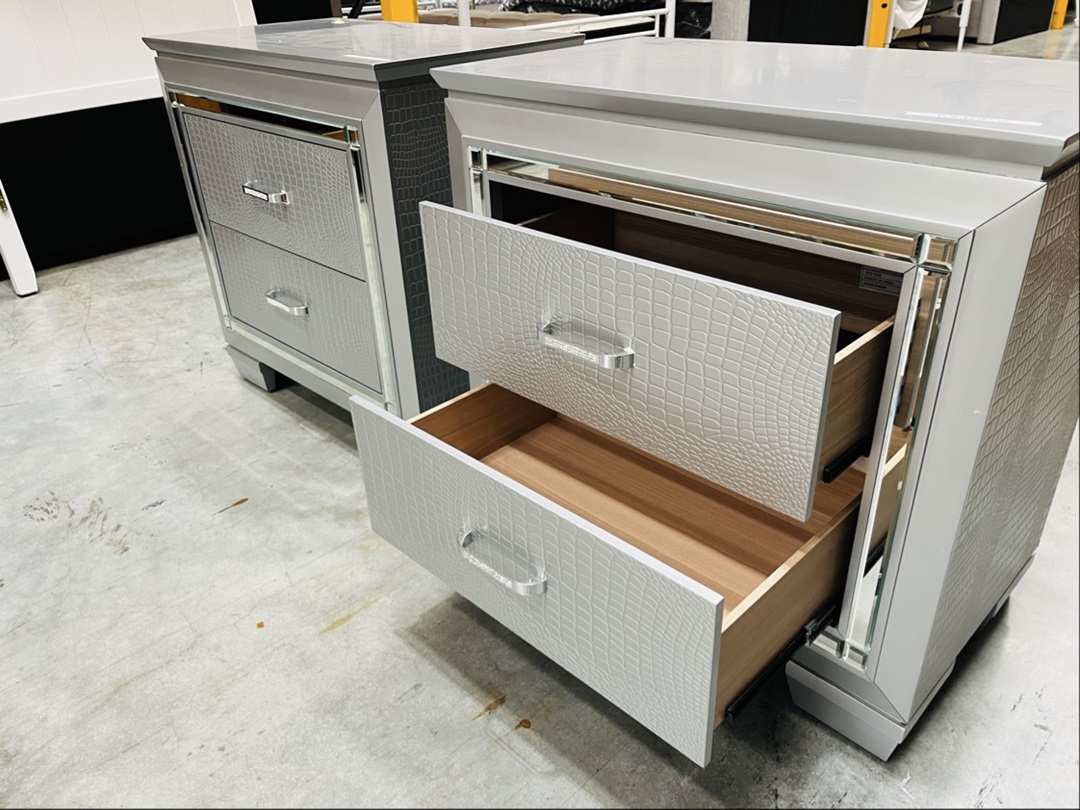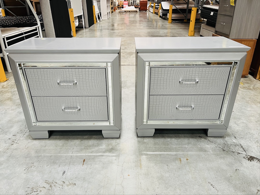 This elegant pair of silver-finished bedside tables offers both style and functionality. Each features two spacious drawers with a refined metallic sheen. Ideal for modern or glam-inspired interiors.
