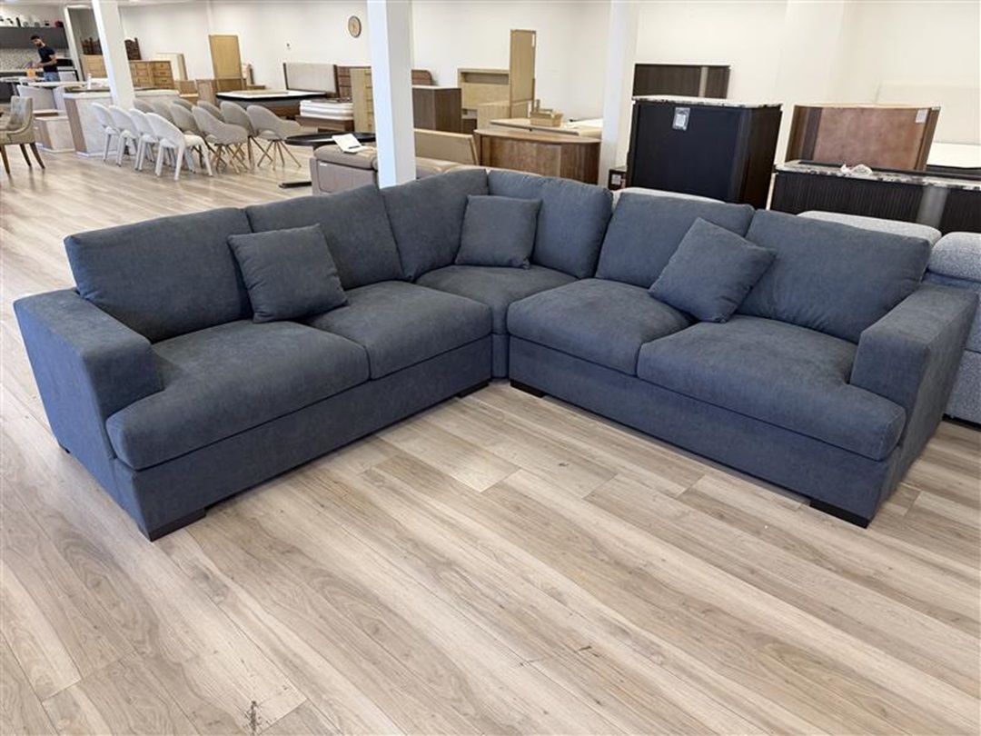 A modern corner sofa upholstered in soft slate grey fabric. Its spacious L-shape design offers generous seating and a sleek, understated look for contemporary living rooms.