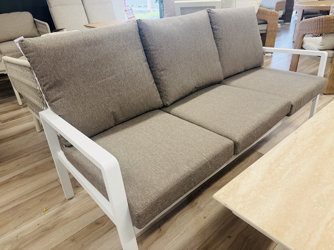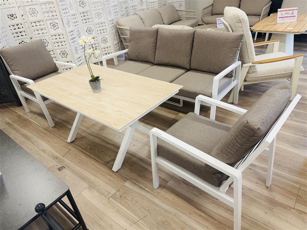 The Light Brown & White Outdoor Aluminium 4pc Sofa Set features a fresh, airy look with supportive seating and a strong aluminium frame. Ideal for outdoor lounging, it brings comfort and modern elegance to patios and gardens.