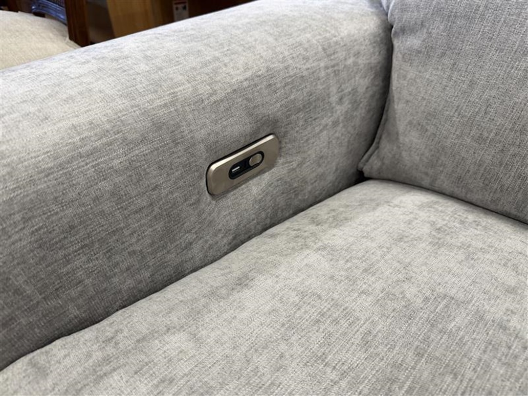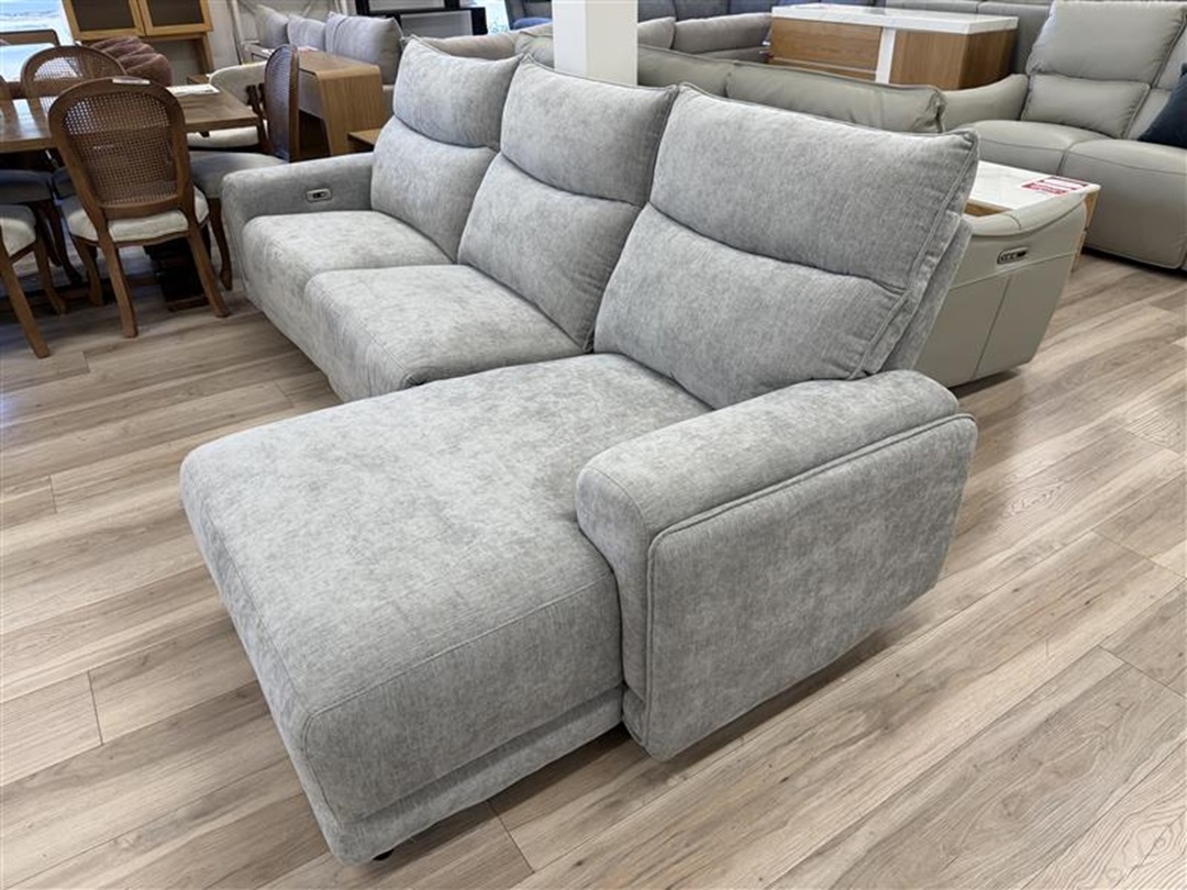 A comfortable electric chaise lounge upholstered in soft light grey fabric. Offers adjustable reclining at the touch of a button, perfect for relaxing in modern living spaces.