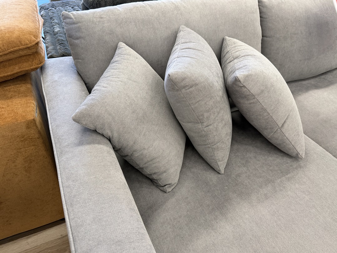 A flexible modular sofa in light grey fabric, designed to adapt to your room layout. The movable ottoman allows multiple seating configurations. Perfect for modern homes needing both comfort and versatility.