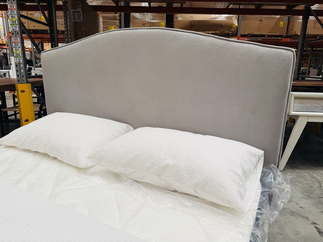 A modern queen bed upholstered in soft light grey fabric. Featuring two built-in storage drawers, it combines comfort with practicality, perfect for keeping your bedroom neat and organized.