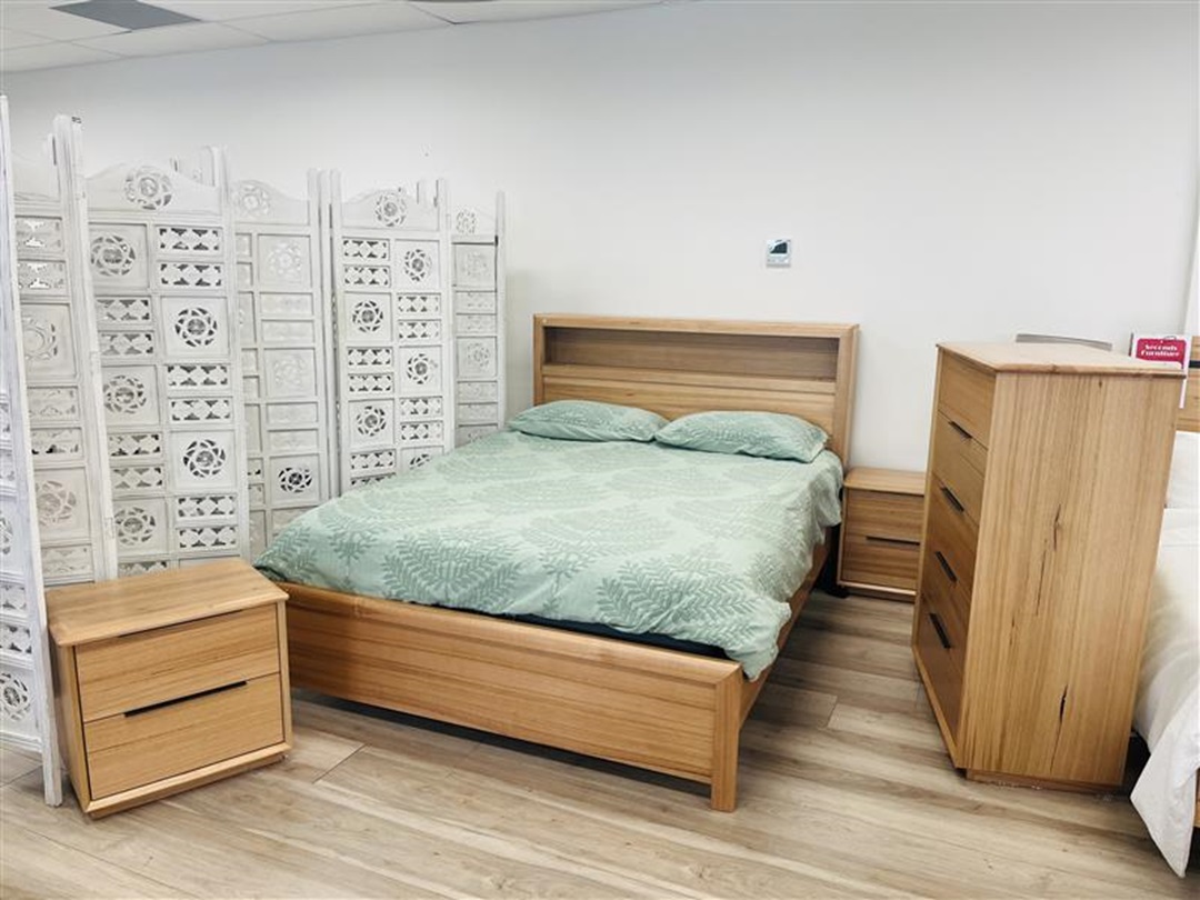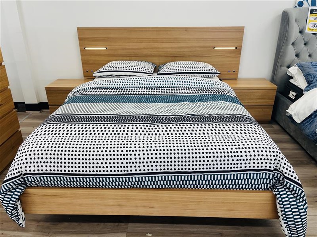Crafted from light honey timber, this queen suite brings a soft, inviting tone to any space. The built-in lights and USB ports add a touch of modern functionality. Designed to combine natural charm with everyday comfort.