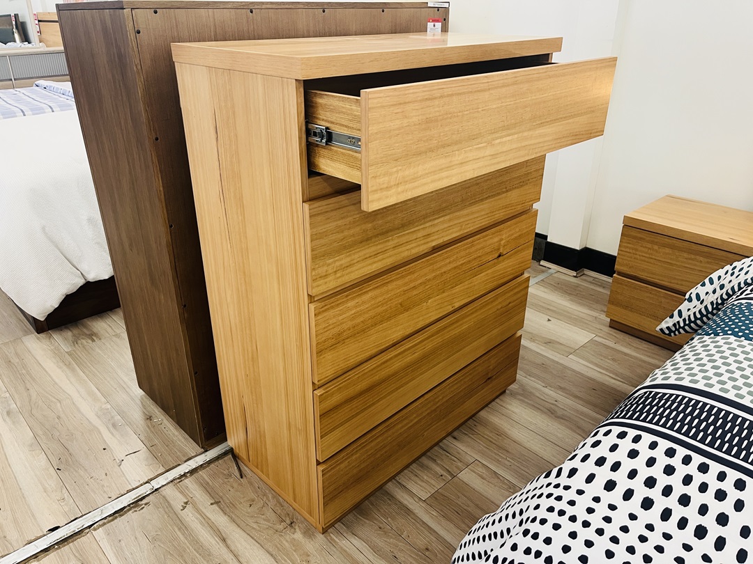 A sophisticated five-drawer tallboy made from walnut timber, providing ample storage and an elegant design to enhance any bedroom space.