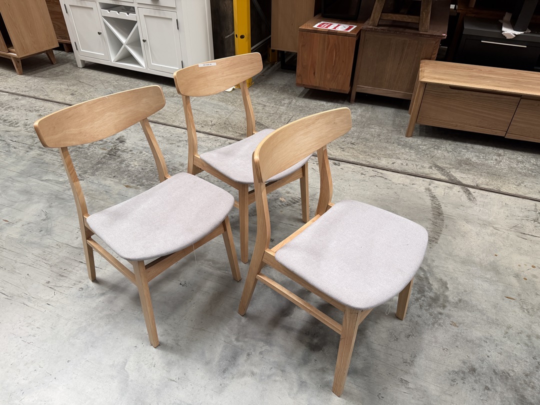 A stylish dining chair made from light oak timber with a soft grey padded seat that offers comfort, durability, and a modern natural look for any dining area.