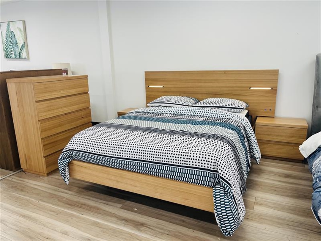 A rich, rustic-style bedroom suite crafted from durable hickory-toned timber. Includes a queen bed frame, two bedside tables, a tallboy, and a matching dresser, all designed with timeless lines and a natural wood grain finish.