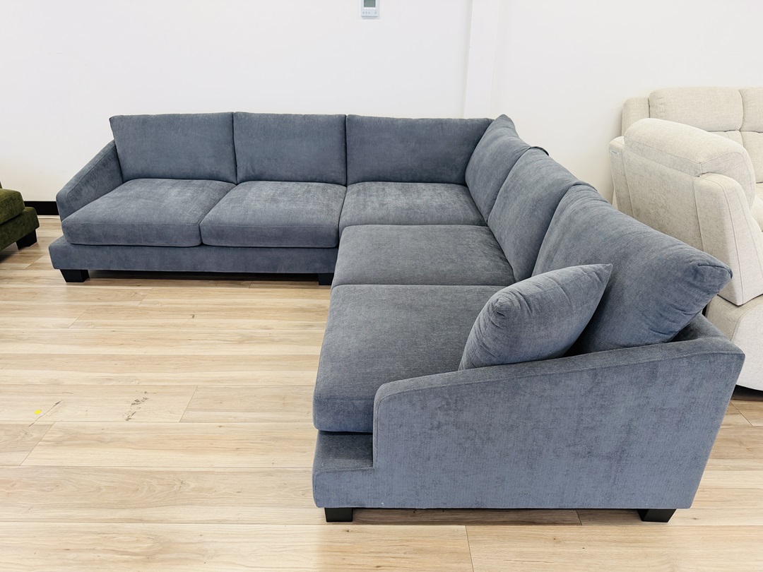 A striking 4-seater corner sofa finished in deep midnight blue fabric. Provides generous seating and a modern design, making it a standout piece for any living space.