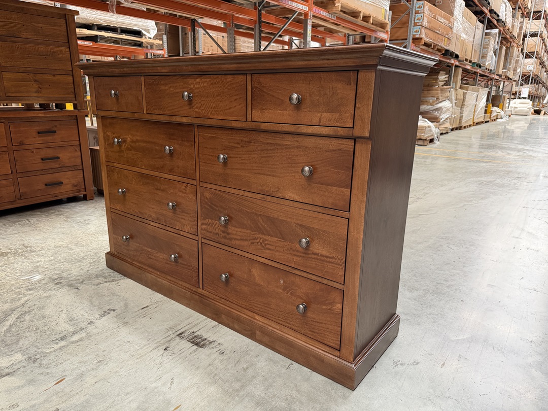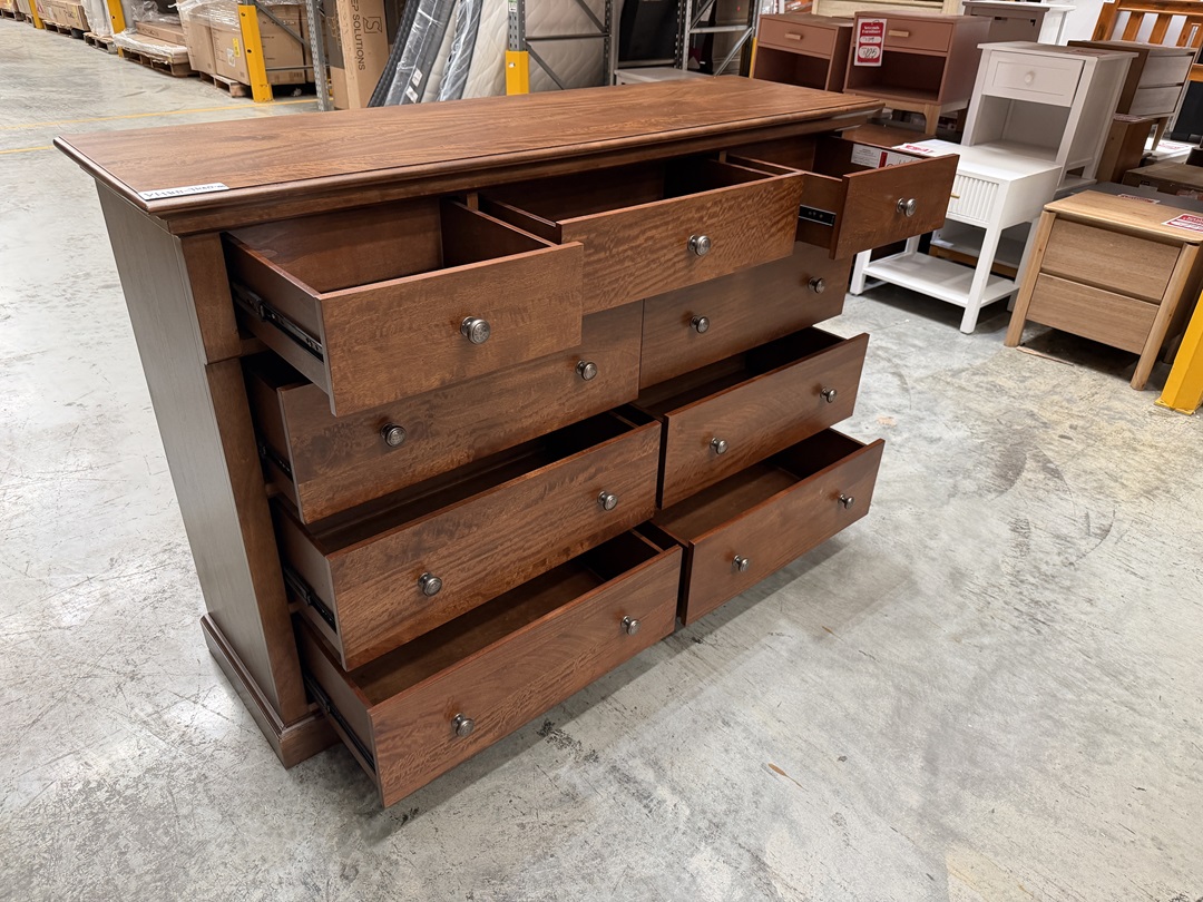 A spacious and elegant dresser finished in rich mocca timber. Featuring nine generously sized drawers, it offers ample storage while adding warmth and sophistication to your bedroom.