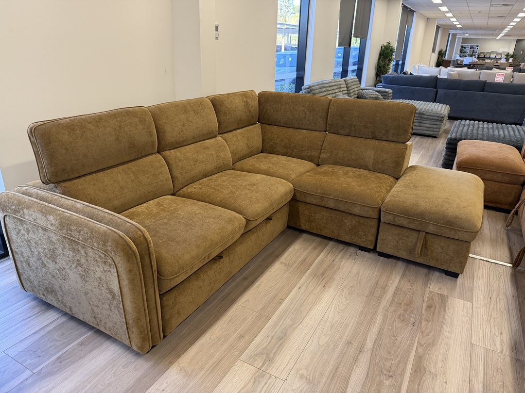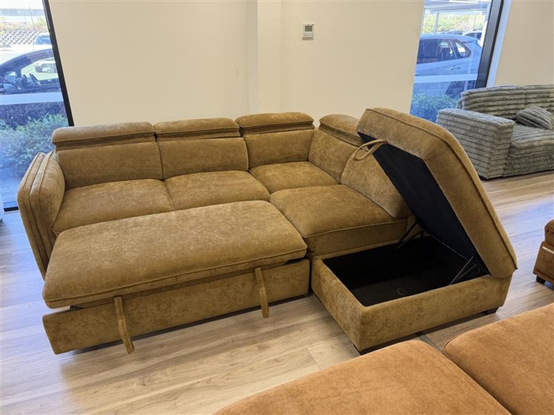 A multifunctional sofabed in bold mustard fabric, featuring a smooth pull-out sleeper function. Includes a spacious storage ottoman for added convenience. Ideal for guests, compact spaces, or family rooms.