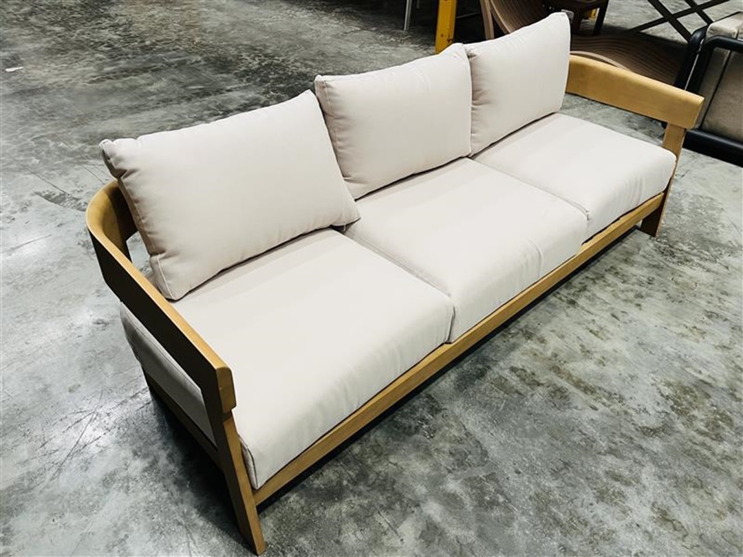 A stylish outdoor or indoor 3-seater crafted from natural timber with plush beige cushions. Combines rustic charm with relaxing comfort. Perfect for patios, balconies, or living areas.