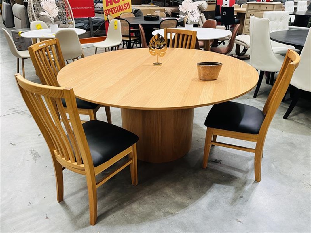 This 5-piece dining set includes a round timber table and four matching chairs. Crafted from natural wood, it brings warmth and charm to your dining area. Ideal for family meals or relaxed gatherings.