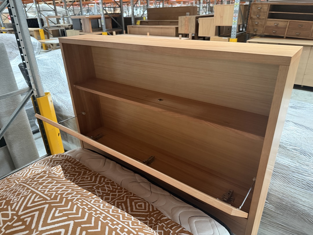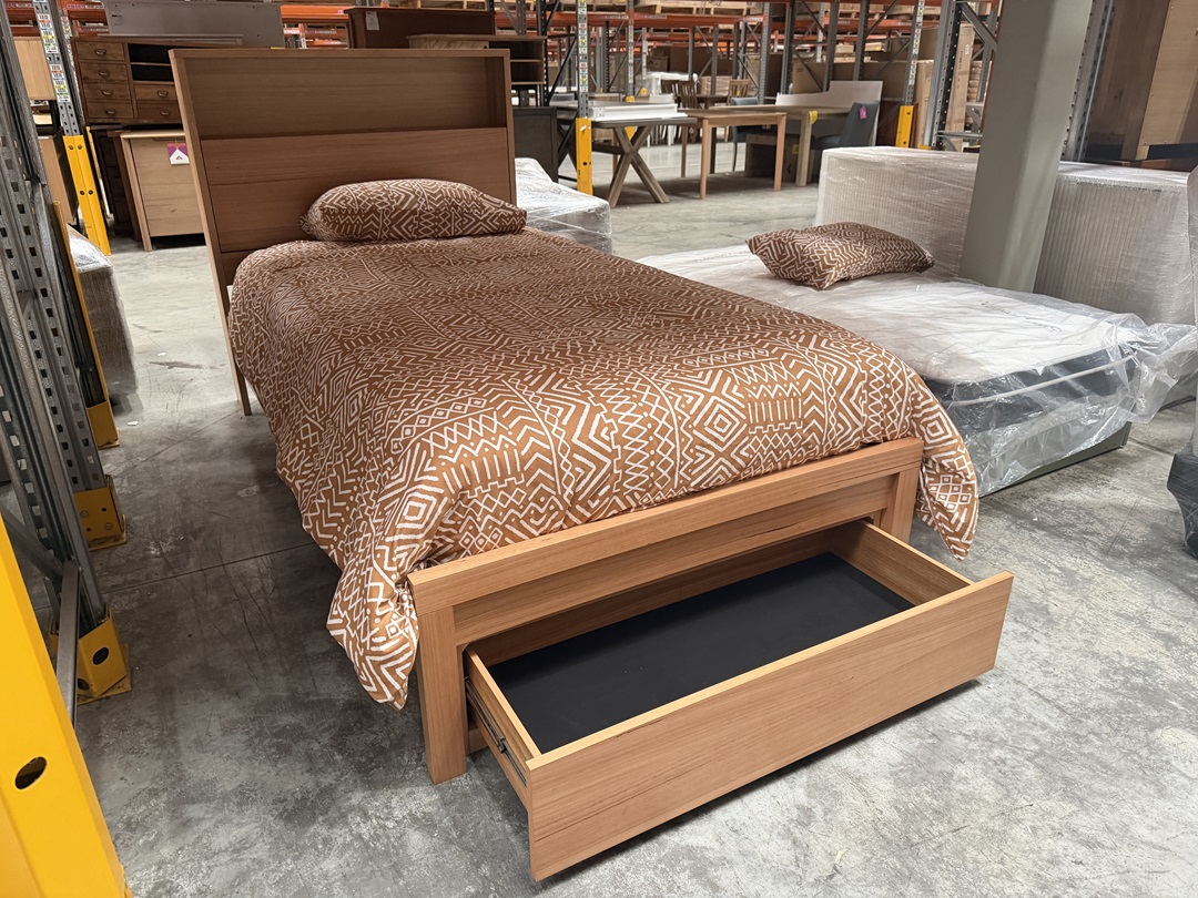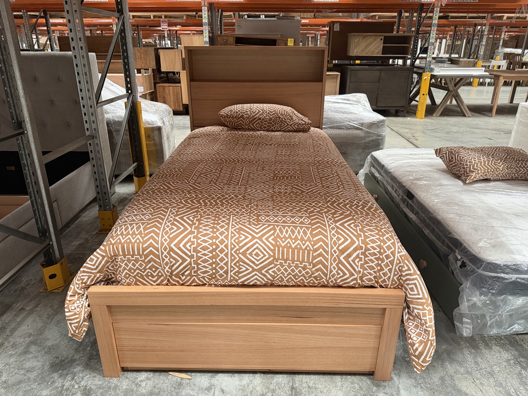 A multifunctional natural timber king single bed designed with built-in drawer storage, an open shelf, USB charging port, and integrated light for modern convenience.