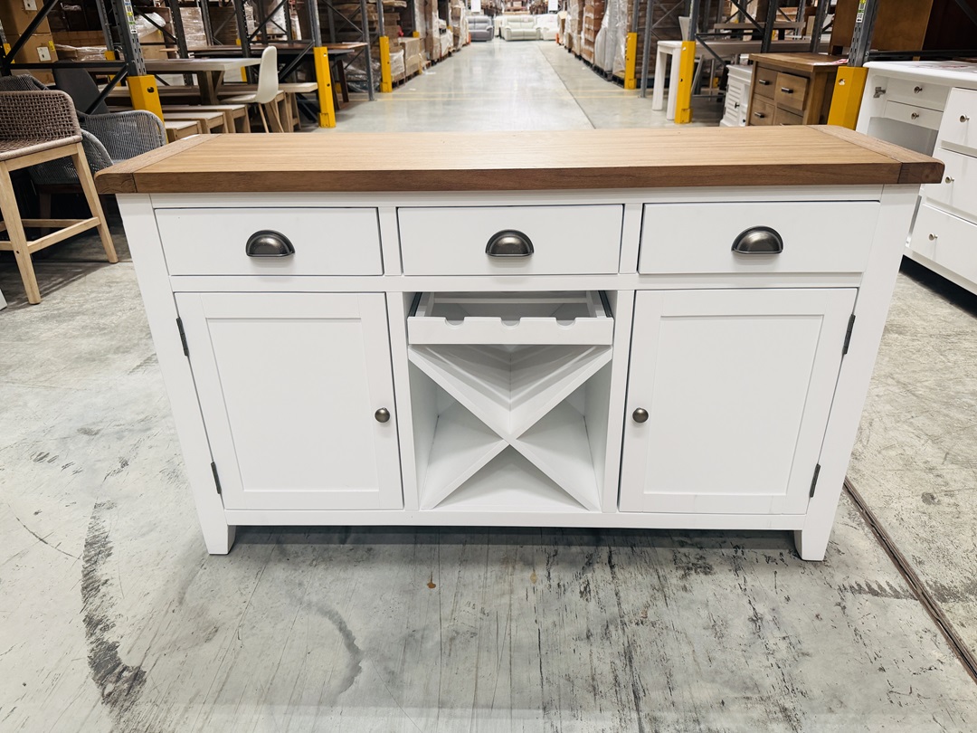 This natural timber buffet offers three doors and three open niches for storage and display. Supported by strong black metal legs, it delivers a modern industrial feel. A practical and stylish addition to dining or living spaces.