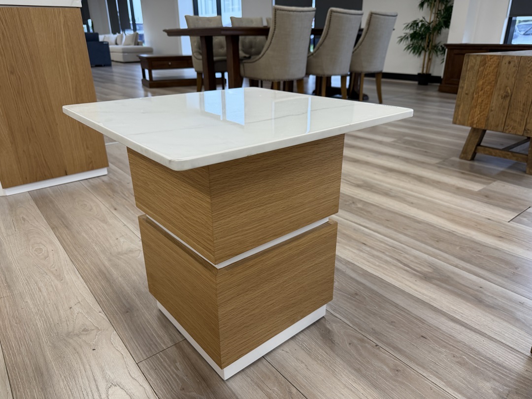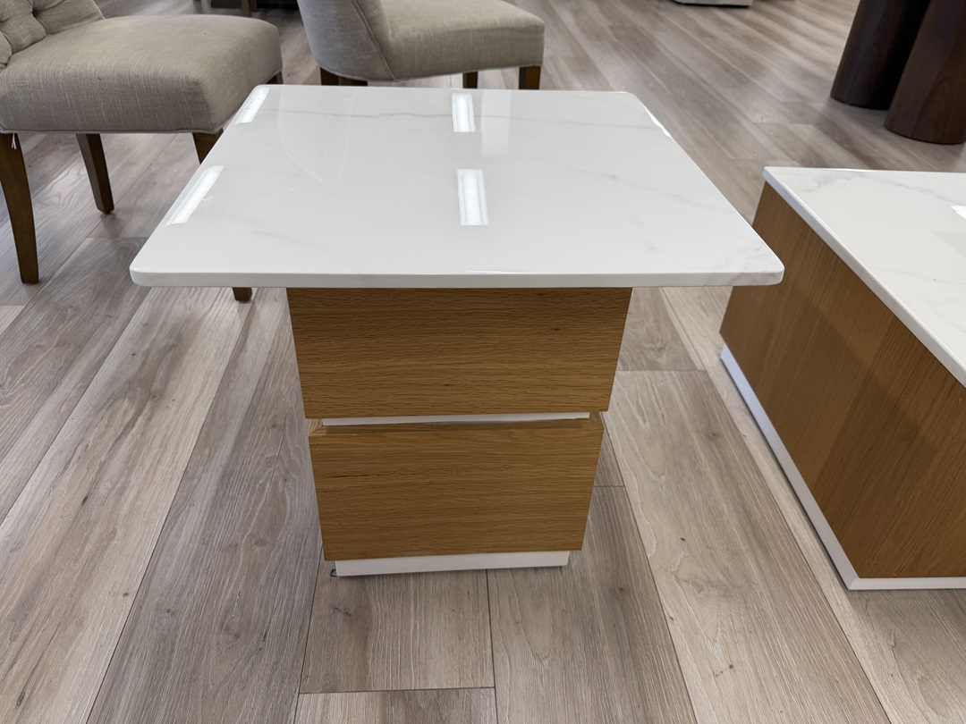 This compact square side table features a striking marble top on a natural-and-white timber base. Ideal for placement beside sofas or beds. Adds a touch of luxury to any room setting.