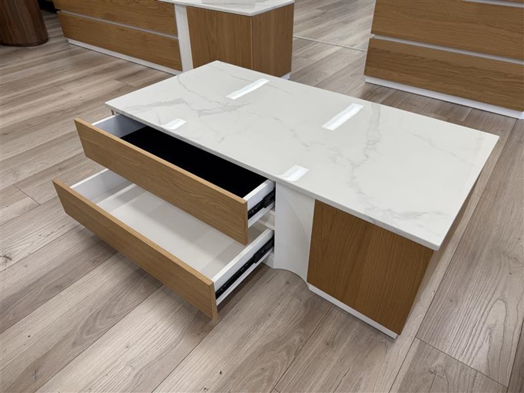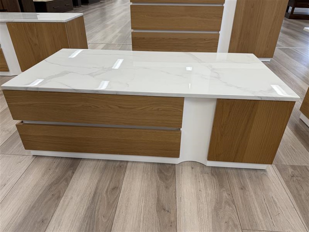 A modern coffee table combining warm timber tones with a smooth marble top. Provides a stylish centrepiece for your living room. Strong, elegant, and perfect for contemporary interiors.
