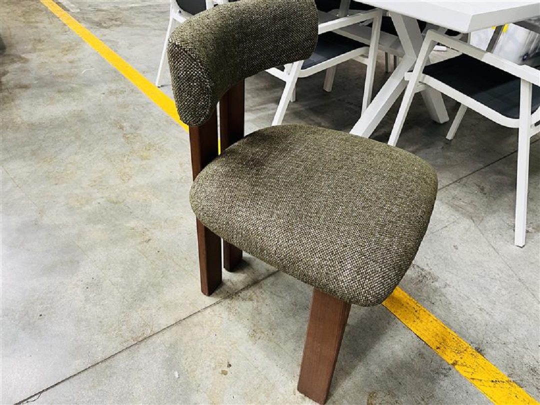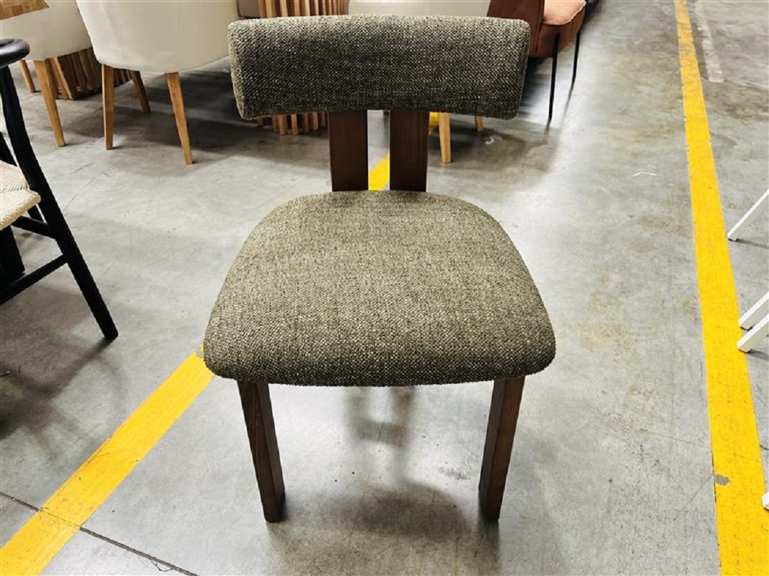 A stylish dining chair in a rich olive green fabric, paired with elegant walnut legs, offering both comfort and a pop of color. Perfect for modern dining spaces with a touch of nature-inspired design.