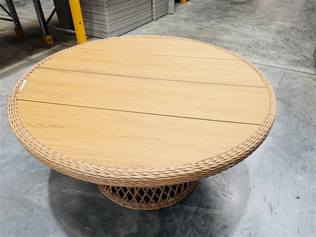 A stylish outdoor dining table crafted with natural wicker detailing in a round design. Perfect for patios and garden spaces, it combines durability with relaxed outdoor charm.