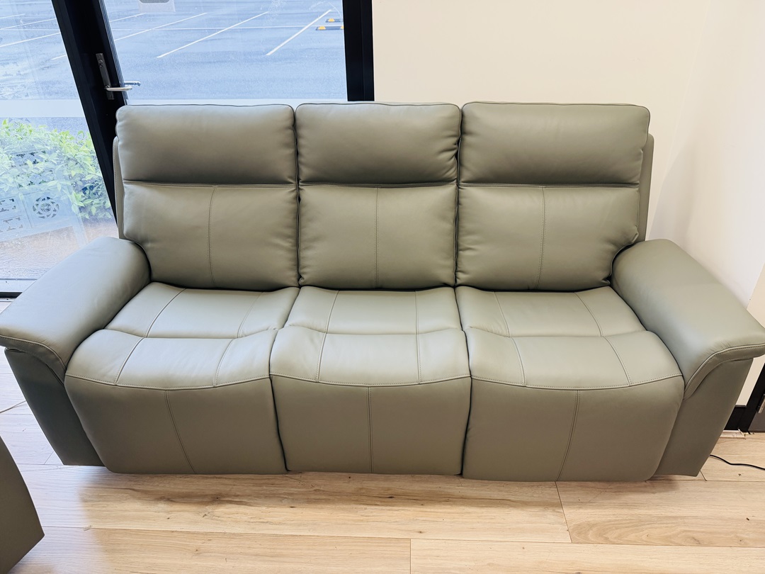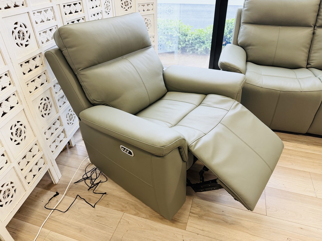 A pewter leather dual-motor recliner set with independent footrest and backrest control, delivering comfort, durability, and easy maintenance.